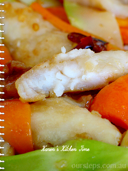 滑溜鱼片是俺家虎公的招牌菜,鲜鱼肉片薄片,淀粉,生抽,糖,抓一下。 不粘炒锅放少许橄榄油,滑熟,配菜大火烧为炒上色即可,混合后出锅。 ![]() <img src="http://www.oursteps.com.a |